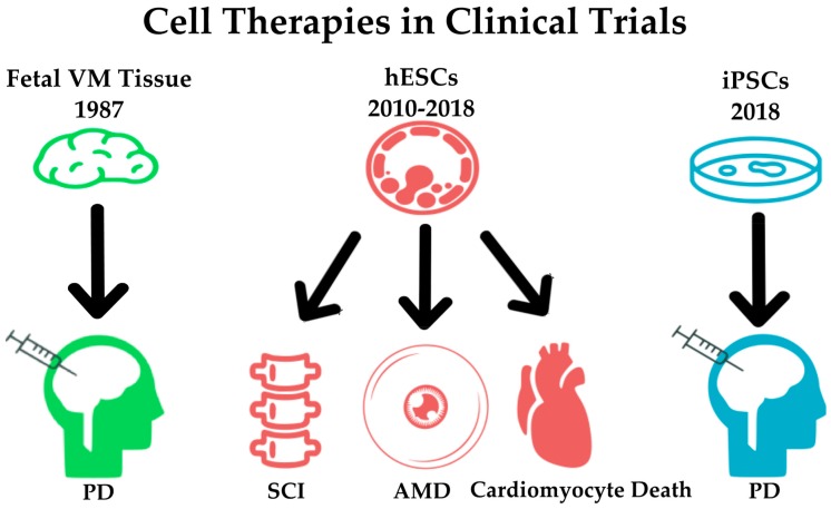 從1987年開始,胎兒腹側(cè)中腦 (VM) 組織被用作第一個(gè)使用細(xì)胞治療PD的臨床試驗(yàn)的細(xì)胞來(lái)源。近年來(lái),人類胚胎干細(xì)胞 (hESC) 被用于許多涉及神經(jīng)變性的臨床試驗(yàn)。hESCs的使用在脊髓損傷 (SCI)、年齡相關(guān)性黃斑變性 (AMD) 以及心臟細(xì)胞損傷方面顯示出特殊的前景。2018年夏天,臨床醫(yī)生開始進(jìn)行首次使用誘導(dǎo)多能干細(xì)胞 (iPSC) 作為細(xì)胞來(lái)源治療PD的人體試驗(yàn)。該試驗(yàn)將在兩年內(nèi)跟蹤7名患者。這些試驗(yàn)的結(jié)果在文中有詳細(xì)說(shuō)明。