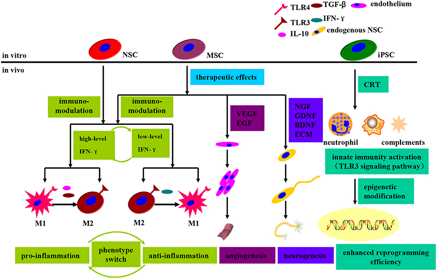 MSCs可分為三種類型:na?veMSCs、神經誘導的MSCs和基因工程的MSCs,它們都可以在移植后直接發揮內在治療作用,例如(i)分泌中性粒細胞因子、生長因子等;(ii) 內源性 MSCs 動機、神經發生和血管生成;(iii) 免疫調節和抗炎作用。