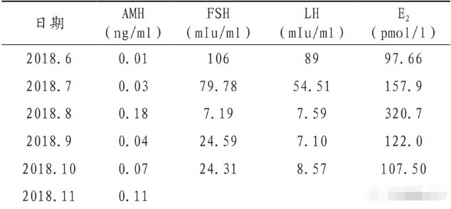 既往病史:11歲開始月經,2009年結婚后用藥推遲生育3年。2012年停藥后出現閉經。經檢查,患者的FSH和LH水平偏高,E2水平偏低,被確診為卵巢功能不全。