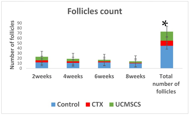 但總的來(lái)說(shuō),臍帶血間充質(zhì)干細(xì)胞 (UCMSCs) 中的卵泡計(jì)數(shù)) 綠色組在CTX組中顯著增加 (* p<0.05)。