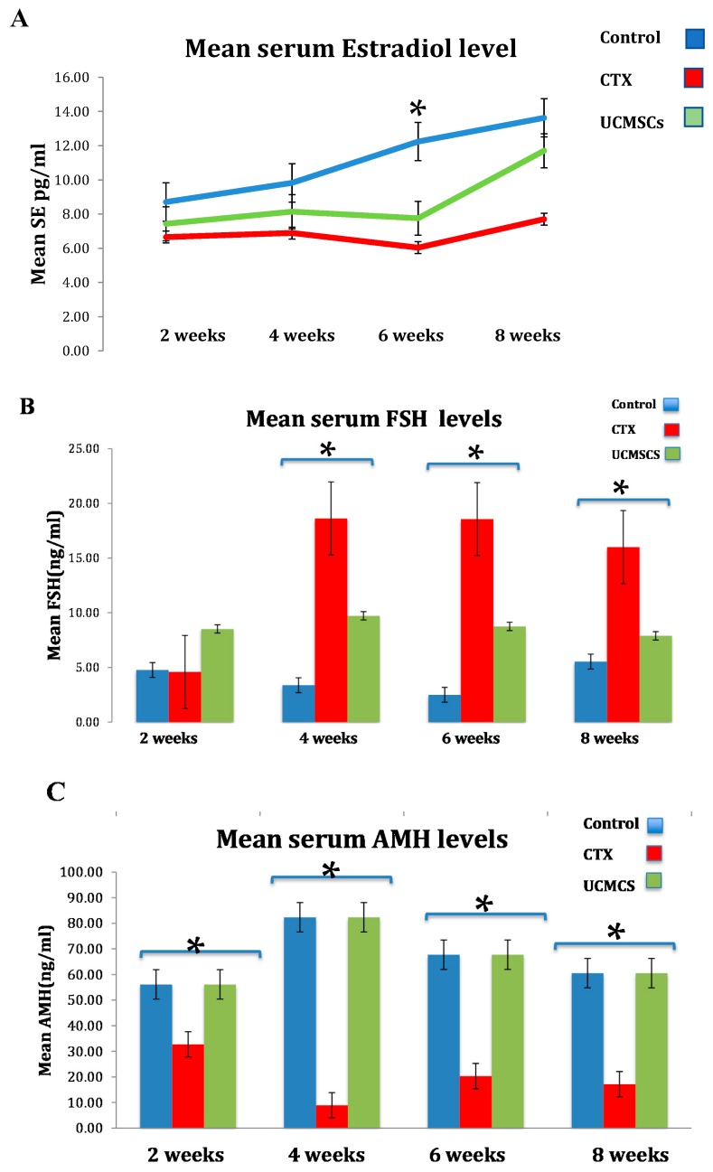 材料和方法:一項(xiàng)臨床前小鼠病例與載體對(duì)照隨機(jī)研究。三組中的每組都同時(shí)進(jìn)行了兩個(gè)實(shí)驗(yàn)。首先是證明UCMSCs恢復(fù)卵巢功能的能力。第二個(gè)是證明提高生育能力。總共36只小鼠被隨機(jī)分配;6只小鼠分成3組,每組進(jìn)行2次實(shí)驗(yàn)。第1組(對(duì)照組)、第2組(假化療)、第3組(干細(xì)胞)。