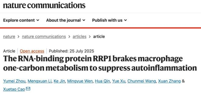 2025年7月25日,中國醫學科學院系統醫學研究院曹雪濤院士團隊在《Nature Communications》上發表了題為:The RNA-binding protein RRP1 brakes macrophage one-carbon metabolism to suppress autoinflammation的研究論文。[10]