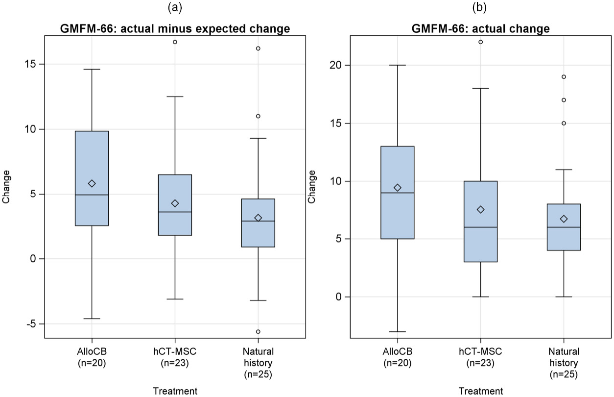 (a) 研究的主要結果是GMFM-66從基線到第12個月的實際減去預期變化。平均變化(和95%置信區間)為 5.8 (3.4–8.2)、4.3 (2.2–6.4 ),同種異體臍帶血 (AlloCB)、人臍帶組織來源的間充質基質細胞 (hCT-MSC) 和自然歷史臂分別為 3.1 (1.4–5.0)。