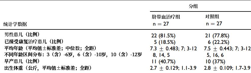 這項(xiàng)臨床研究入組了54名患兒,平均分為兩組。治療組的27人在大約一個(gè)月內(nèi)接受了4次臍帶間充質(zhì)干細(xì)胞輸注(單次細(xì)胞量為5×10^7,每次間隔7天),而對(duì)照組的27人輸注的是0.9%生理鹽水。兩組受試者均同時(shí)接受基礎(chǔ)康復(fù)治療。