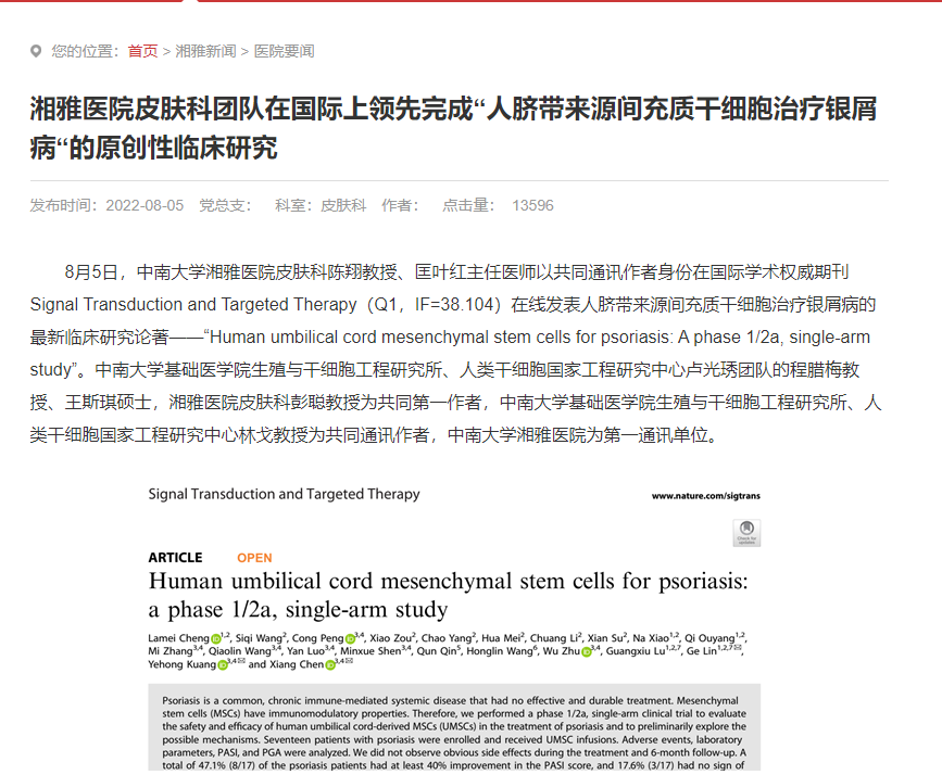 2022年8月5日,中南大學(xué)湘雅醫(yī)院在Nature子刊《signal transduction and targeted therapy》發(fā)表間充質(zhì)干細(xì)胞治療銀屑病最新臨床研究結(jié)果。