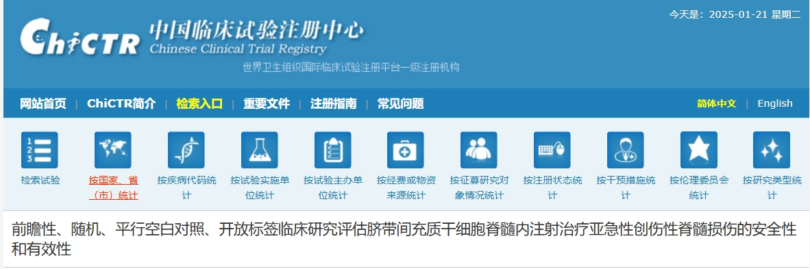 2025年1月20日,西安高新醫(yī)院在《中國臨床試驗中心》上注冊了一項關(guān)于“前瞻性、隨機、平行空白對照、開放標簽臨床研究評估臍帶間充質(zhì)干細胞脊髓內(nèi)注射治療亞急性創(chuàng)傷性脊髓損傷的安全性和有效性”的臨床試驗正在招募患者,這一消息無疑為廣大脊髓損傷患者帶來了新的希望!