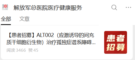 近日,解放軍總醫院第一醫學中心(即常說的“301醫院”)兒科發布一項臨床研究招募信息,宣布開展 ALT002(應激誘導的間充質干細胞衍生物) 用于治療孤獨癥譜系障礙(ASD) 的臨床研究。該研究已通過倫理審查,現面向社會招募符合條件的患兒。