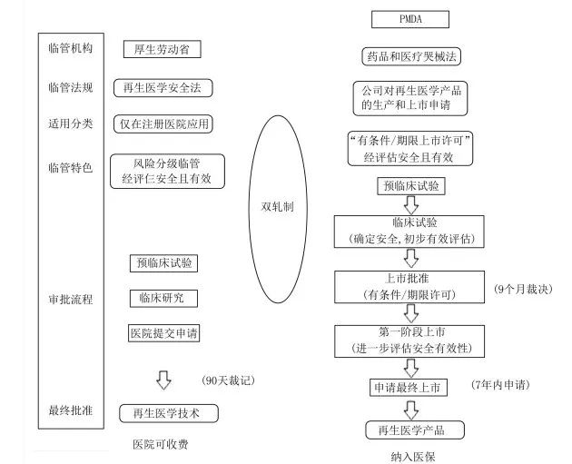 通過(guò)分析日本監(jiān)管法規(guī)可以發(fā)現(xiàn),日本干細(xì)胞采取醫(yī)療技術(shù)和新藥雙軌制監(jiān)管,通過(guò)設(shè)立職責(zé)明確的監(jiān)管機(jī)構(gòu)、制定分類別的法律法規(guī)、打通全流程的監(jiān)管審批步驟,構(gòu)建了兩條完整的監(jiān)管軌道。