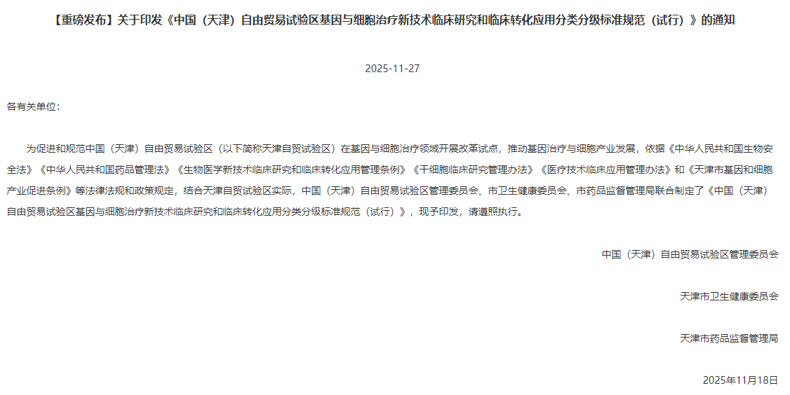 天津依托京津冀區域醫療資源與國家級科研平臺優勢,重點推進細胞臨床研究規范化和成果轉化落地,并探索建立跨醫院、科研機構與企業的樣本和數據共享機制,提高臨床轉化效率。[3]